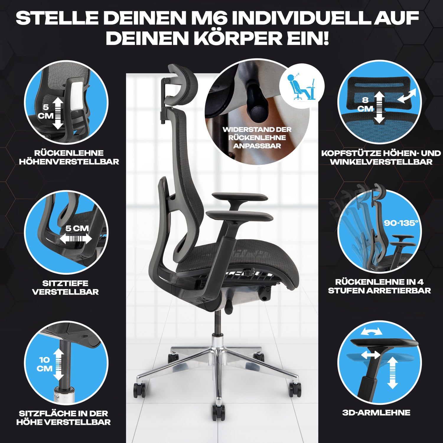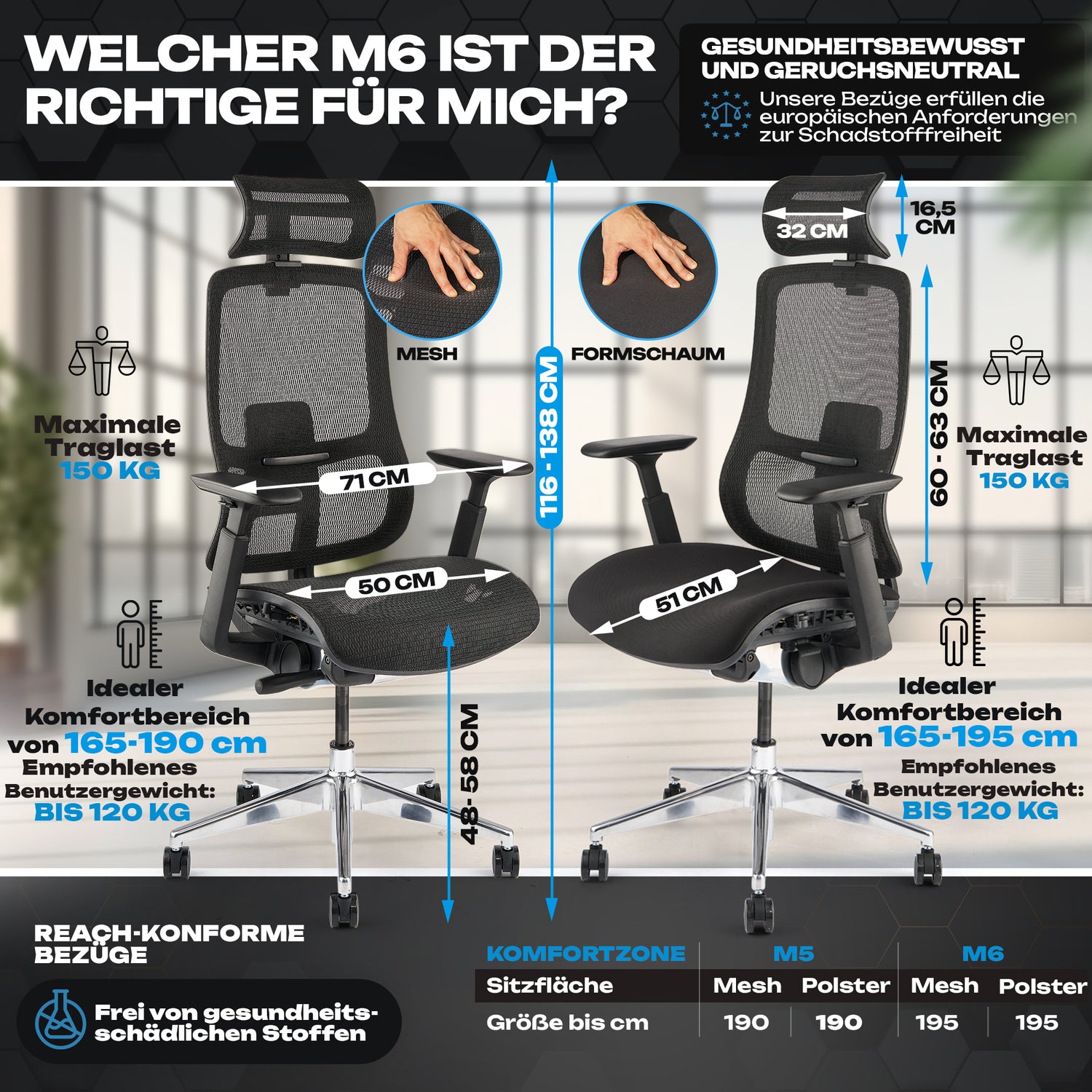 Als 1,93 m Mensch hab ich bisher immer Probleme mit normalen Stühlen gehabt – bis zum VALKENSTOL M6. Der ist richtig großzügig gebaut, breitere Sitzfläche, super stabile Mechanik und das Alu-Fußkreuz sieht auch noch richtig nobel aus. Die Lordosenstütze hält meinen Rücken perfekt und ich kann stundenlang sitzen, ohne zu schwitzen oder Schmerzen zu bekommen. Endlich fühlt sich ein Stuhl an, als wäre er für mich gemacht. Sehr empfehlenswert!