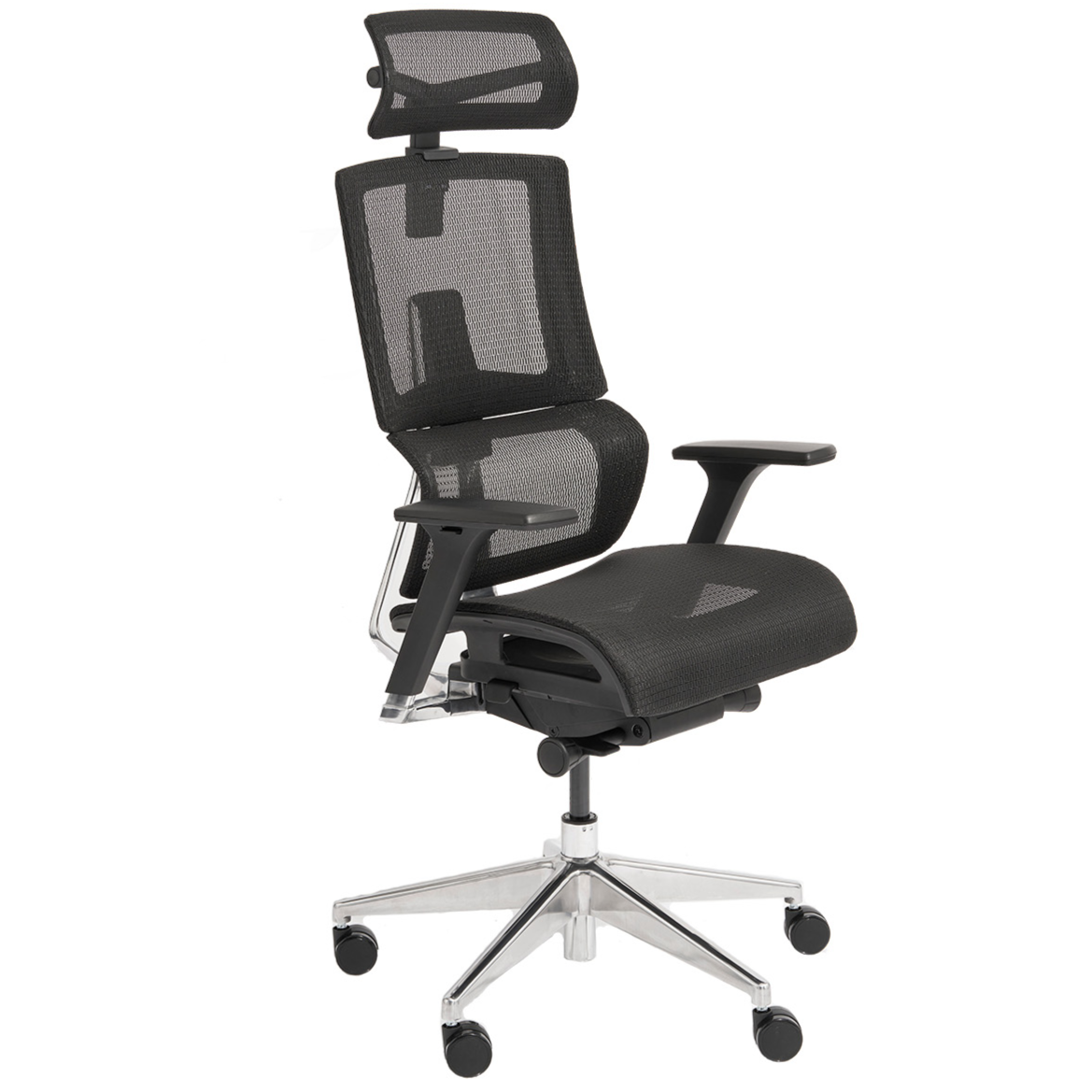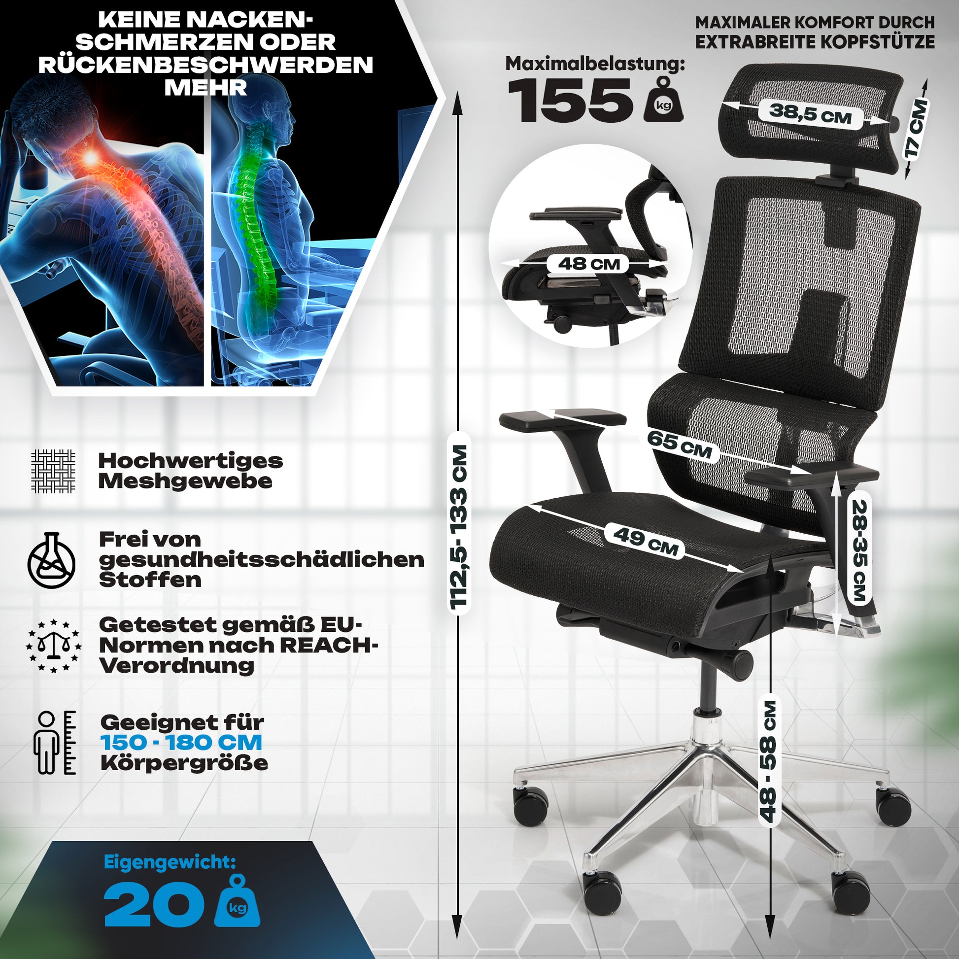 Die Rückenlehne und die in das Mesh-Gewebe integrierte adaptive Lordosenstütze lassen sich in der Höhe verstellen und so ideal auch für größere Menschen anpassen.